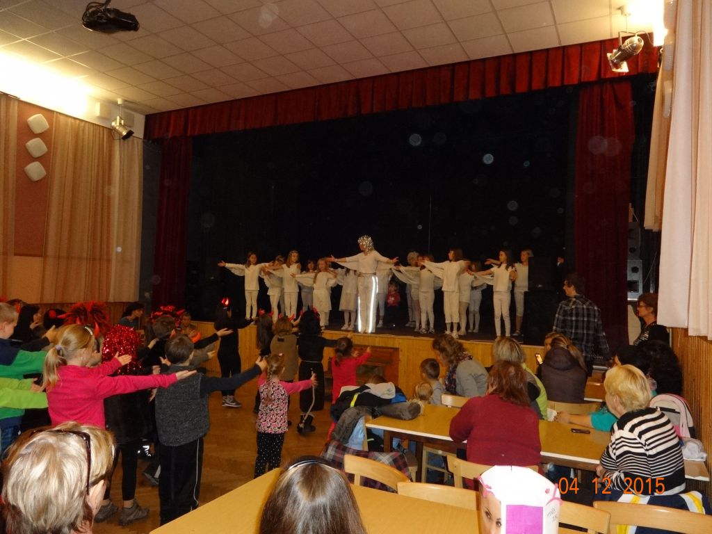 Program si pro všechny přítomné připravily děti ze školní družiny. Rozkošné pásmo rozpustilých čertíků bylo vystřídáno tanečním vířením nebeských andílků. Do jejich zpěvu a okouzlujícího reje zabloudil i jeden roztomilý nešika, kterého si děti vypůjčily z pohádky Anděl Páně. Poté se všichni přesunuli na parket a naučili se několik čertovských tanečků. V závěru příjemně prožitého odpoledne předali Mikuláš s čertem hodným dětem toužebně očekávanou nadílku.