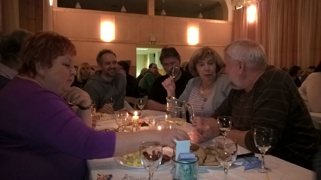 Dvě hodiny poutavého vyprávění provázené fotoprezentací o vinné révě, zpracování hroznů a produkci vína s ochutnávkou vybraných deseti druhů vín uběhly velmi rychle. Občerstvení v podobě moravských klobás, několika druhů sýrů a neobvyklého výborného chleba s vlašskými ořechy jistě přišlo vhod. Mezi bílými a červenými víny se podávala chutná škvarková pomazánka a chléb.
