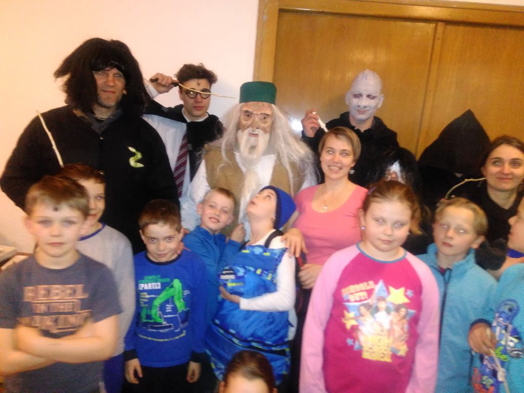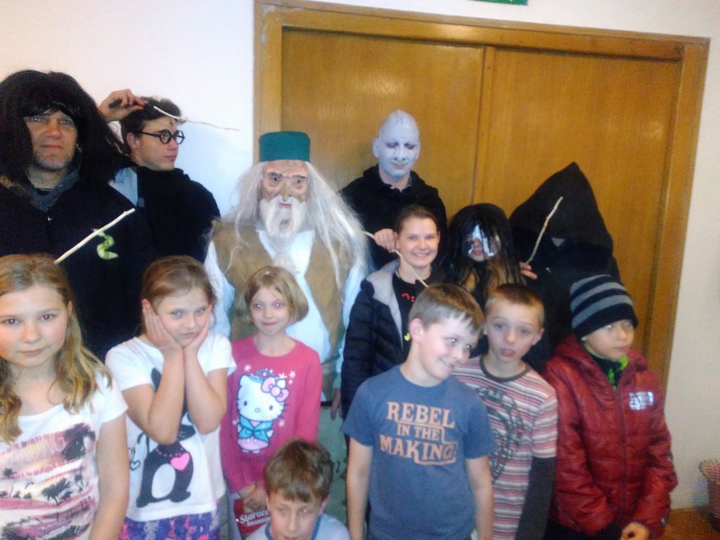 Akce byla určena pro děti z prvního stupně ZŠ. Sešli jsme se v 18 hodin a převlékli se do bradavicích kouzelnických uniforem. Poté kouzelný klobouk rozdělil děti do čtyř skupin/kolejí: Nebelvíru, Zmiozelu, Mrzimoru a Havraspáru.